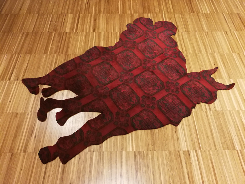Il progetto nasce da un lavoro del 2016, pensato in occasione di una campagna a favore di una famiglia di profughi curdo siriani ospiti nel campo di Idomeni in Grecia. Per sostenere la loro causa Fondazione PInAC aveva organizzato una mostra dei disegni realizzati dalla famiglia e aveva chiesto a me di pensare un’installazione artistica che accompagnasse l’esposizione: ho proposto una serie di sagome di alcuni dettagli dei disegni, ritagliate in vecchi tappeti usati, trasferendo le immagini nello spazio e permettendo al pubblico di camminare fisicamente tra le forme; un modo per attraversare la storia della famiglia in prima persona. Le opere ruotano attorno ad un progetto che ha a che fare con il concetto di confine. Hanno perimetri ben delineati, sono territori chiusi, ma le campiture che ritagliano sono zone vibranti, in movimento. Il fluire del pensiero nella materia transita nello spazio chiuso, ma se c’è movimento i confini sono porosi e non creano attrito. I corpi dei viaggiatori sagomati nei tappeti, metafora della casa e del vivere la quotidianità stanziale, indicano che le rigide geografie che li limitano possono essere oltrepassate; c’è un tentativo di andare oltre le forme chiuse, abbattere le frontiere, confluire una nel perimetro dell’altra in un’installazione corale.